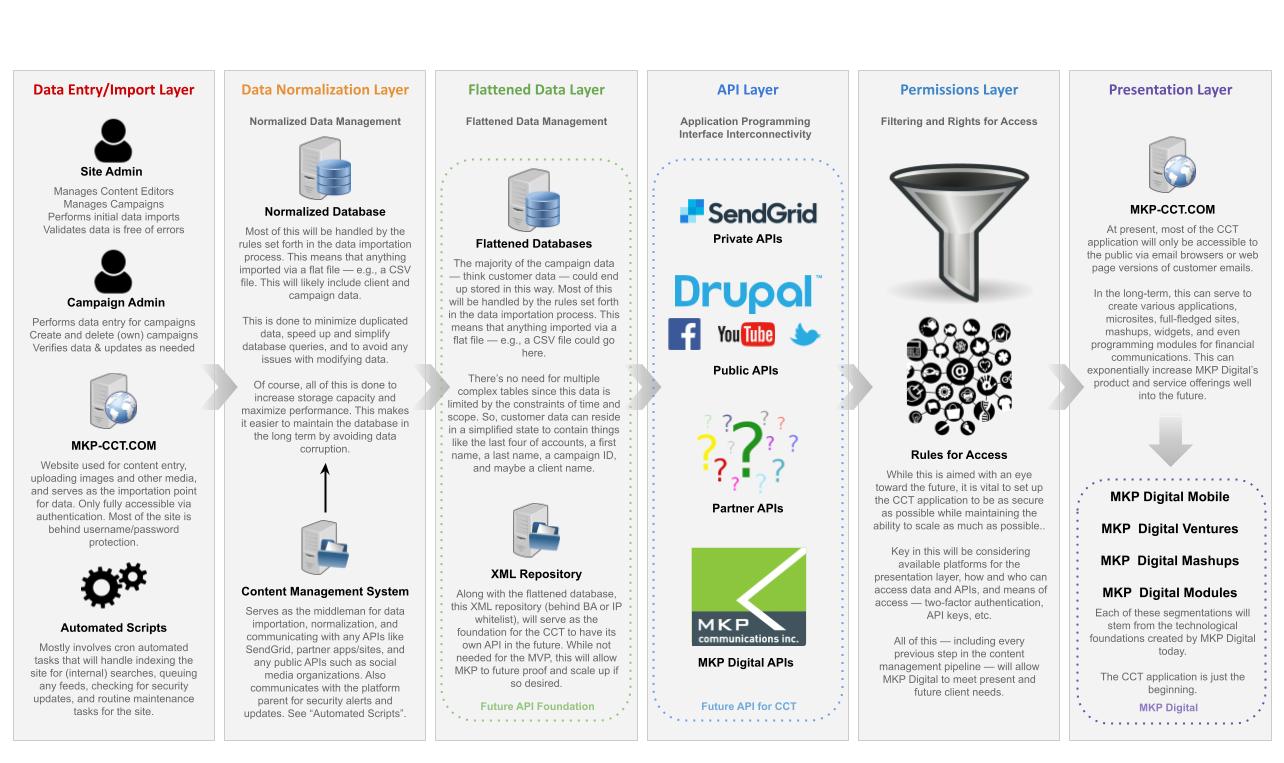 The purpose of the Client Communications Tool is to empower MKP's clients to rapidly communicate with their customers (initially via email only) using specialized financial communications provided by MKP. The pipeline consists of a data entry layer used for importing information, data normalization in a traditional relational database management system via Drupal's CMS, flattened data layers found in CSV/XML files, various API layers for communicating with third party applications exclusively via outbound methods, permissions for restricting who can see/do various tasks, and a presentation layer to make it all beautiful. This process is detailed in the above graphic.